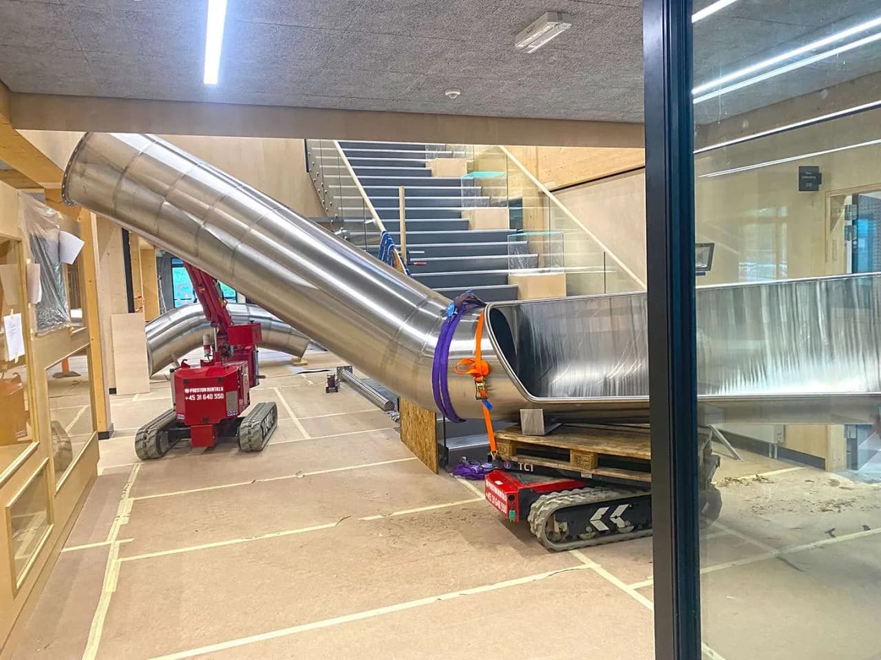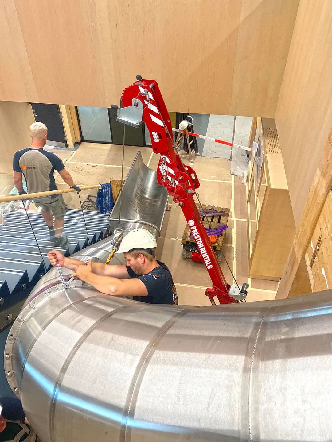 Dieses Projekt demonstriert, wie die kompakten Maschinen von Hoeflon neue Installationsmöglichkeiten an Orten eröffnen, an denen herkömmliche Hebezeuge nicht eingesetzt werden können. Dank der Maschinen von Hoeflon konnte die Rutsche schnell, sicher und beschädigungsfrei installiert werden.