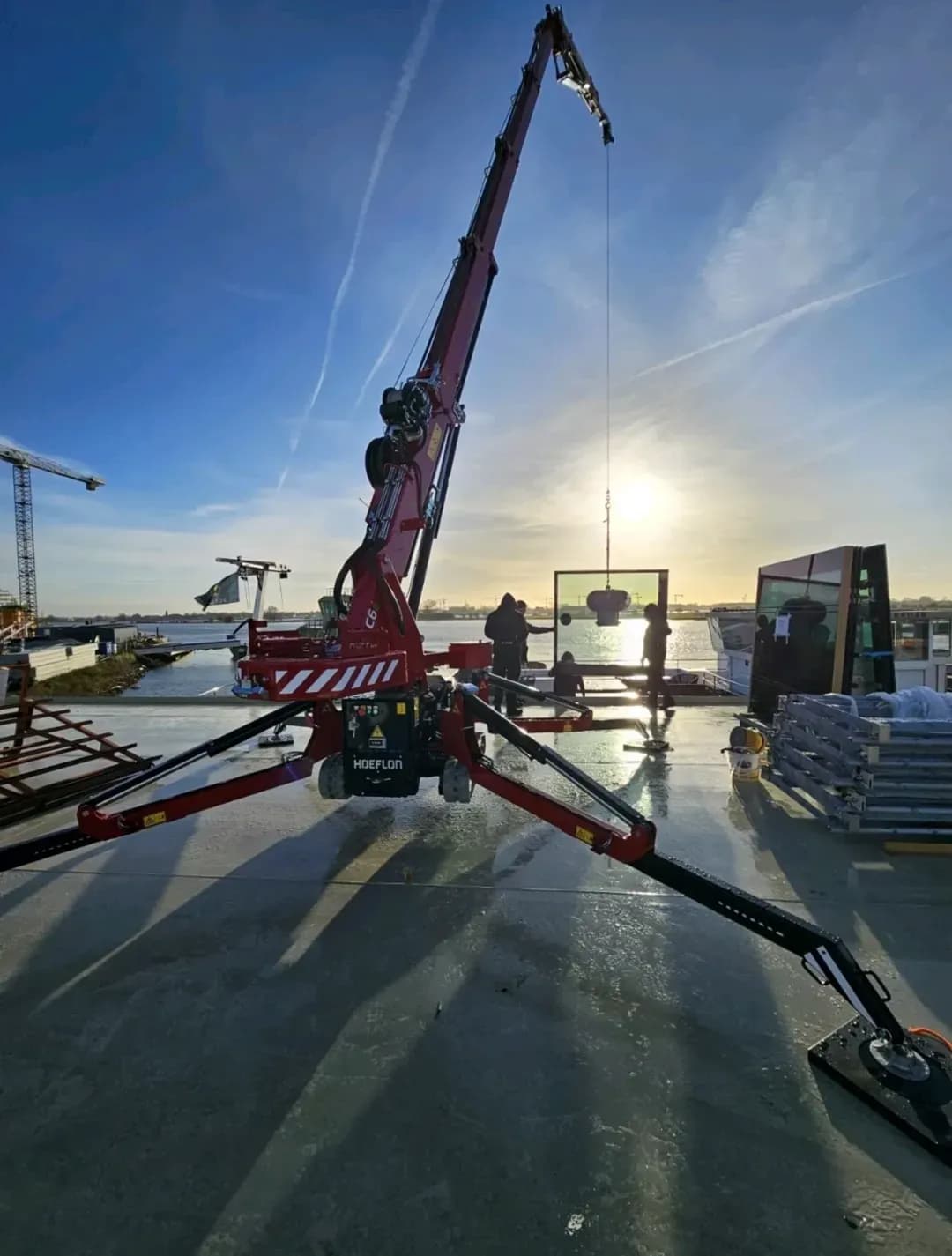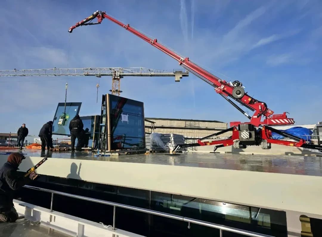 Der kompakte Minikran bot hierfür die ideale Lösung. Dank seiner flexiblen Aufstellung und präzisen Steuerung konnten die Paneele sicher und präzise an ihren Platz gehoben werden. Das Ergebnis: ein elegantes, modernes Erscheinungsbild der Schiffe.