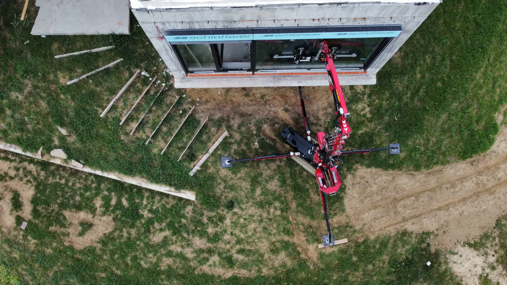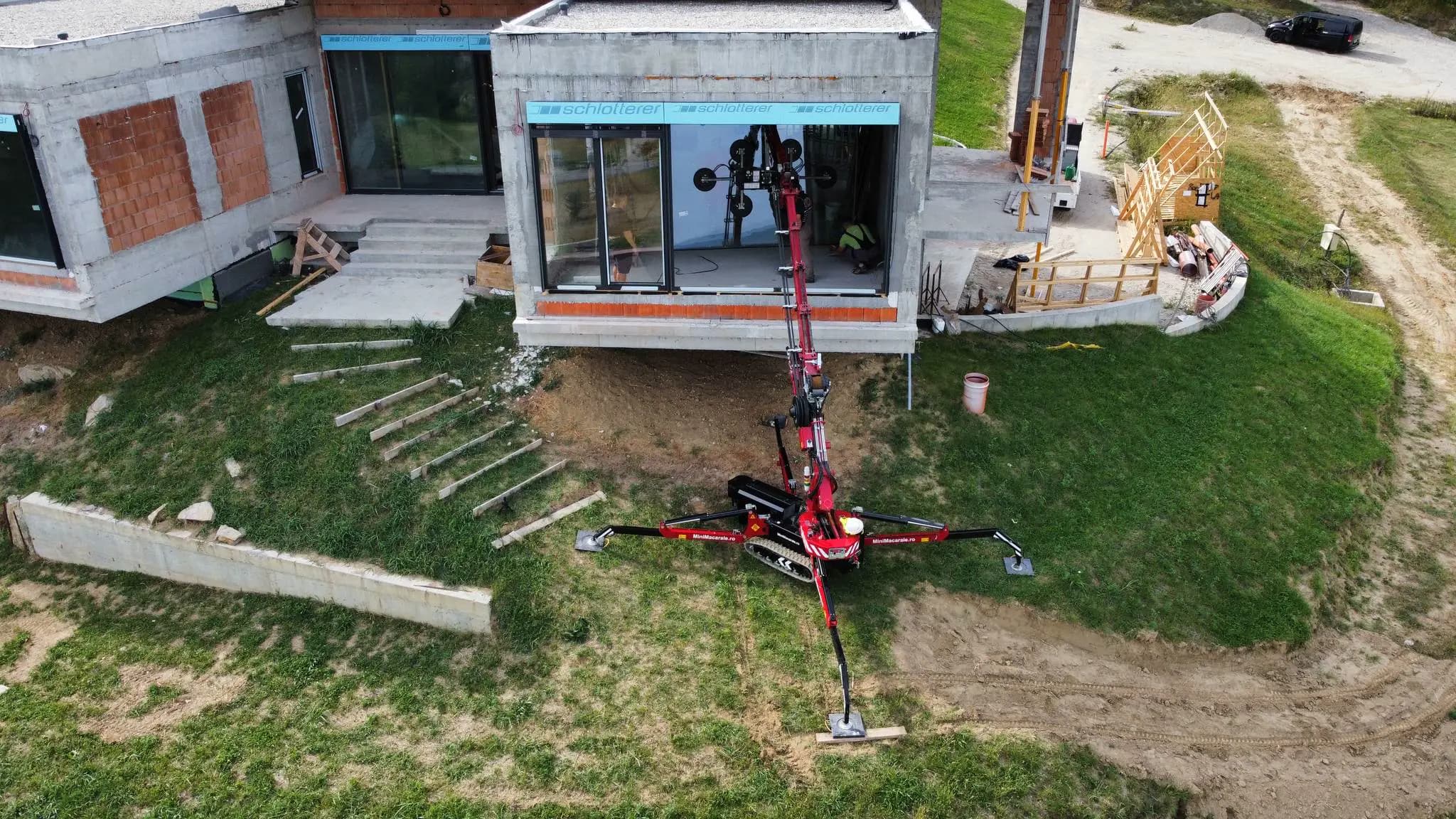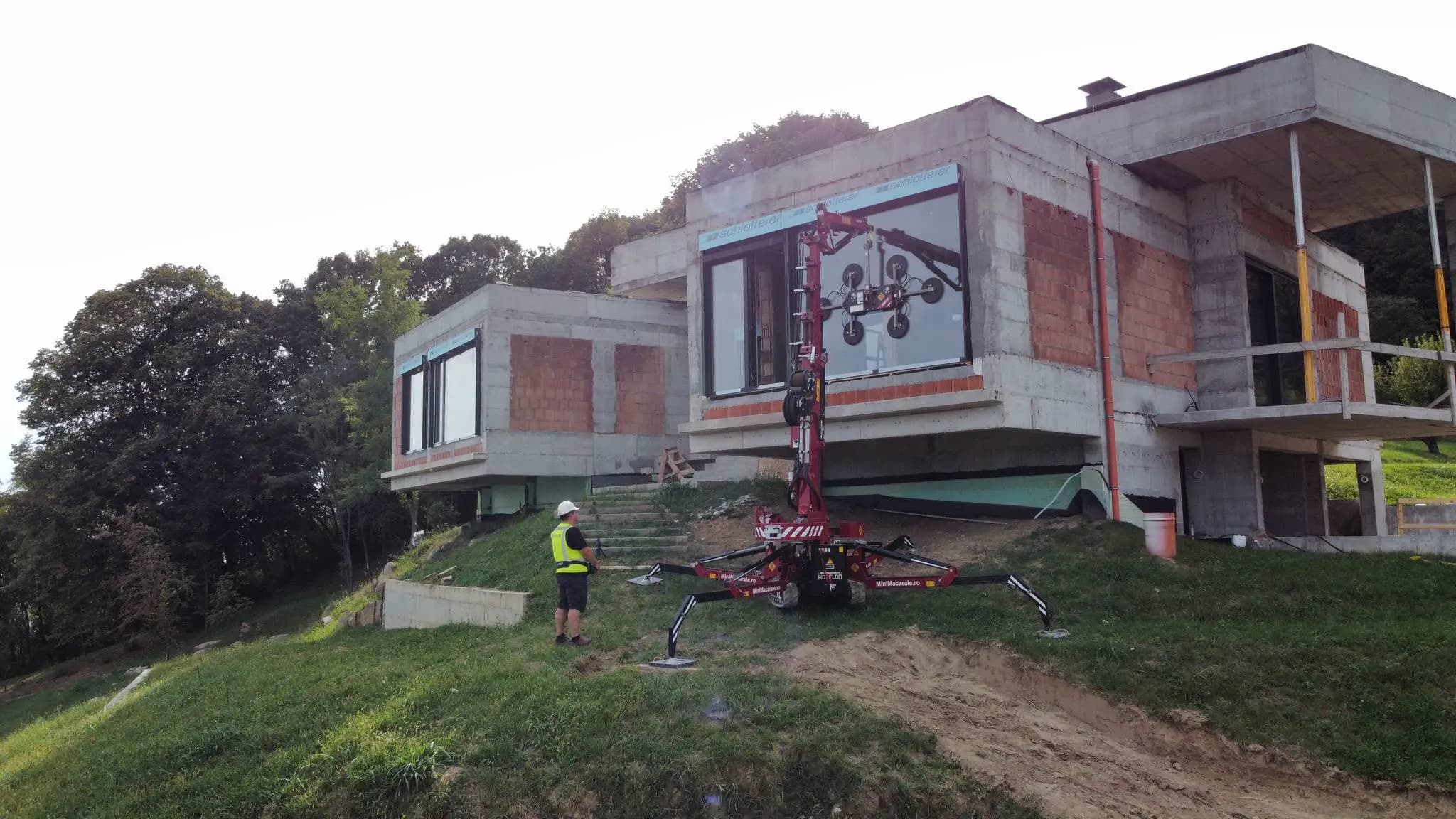 Eine makellose Glasinstallation in Rumänien mit dem Hoeflon C6e von Minimacarale. Die flexible Positionierung an diesem Hang und die einfache, präzise Bedienung sorgen für eine mühelose Glasmontage.