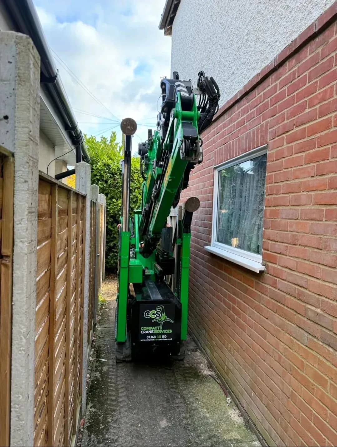 Bei diesem Projekt stellte Compact Crane Services die Leistungsfähigkeit des Hoeflon C6e unter Beweis. Der Kran musste durch eine enge Passage manövrieren, um den Hinterhof zu erreichen: eine Herausforderung, die ein herkömmlicher Kran einfach nicht hätte bewältigen können.