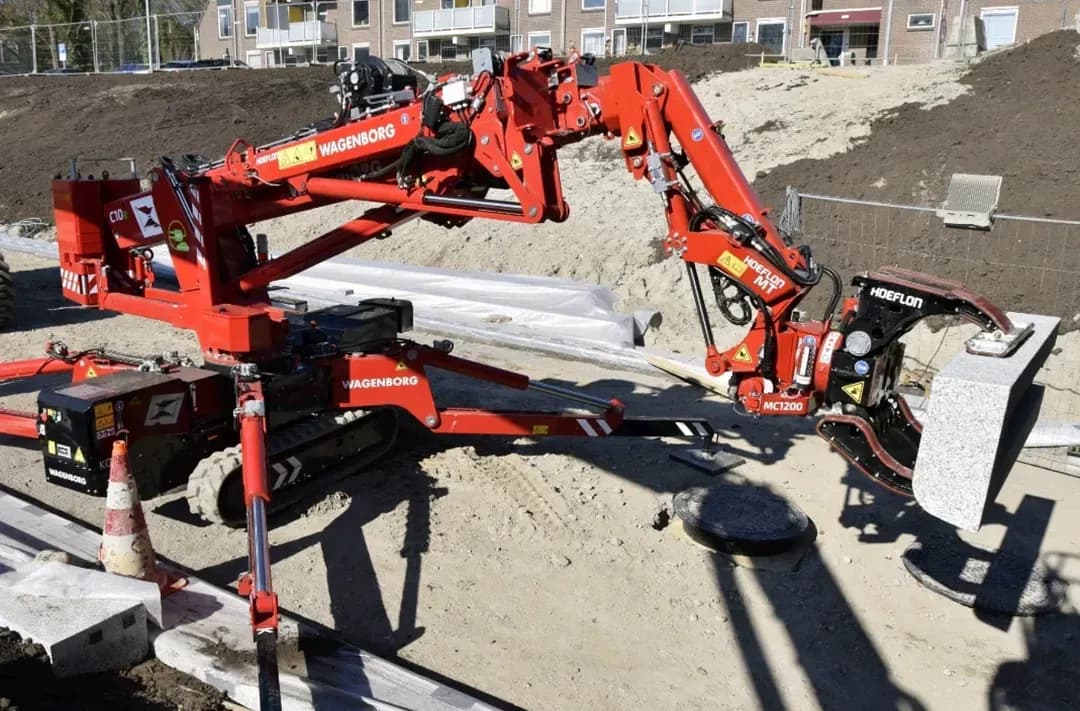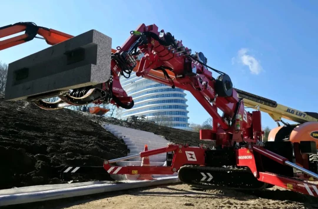 Beim Bau eines Fahrradtunnels stand Wagenborg Nedlift vor der Herausforderung, schwere Natursteinelemente mit einem Gewicht von ca. 250 kg präzise zu bewegen und zu installieren. Für diese Spezialaufgabe wurde der Hoeflon C10e in Kombination mit dem Multitool und der Multiclaw ausgewählt.